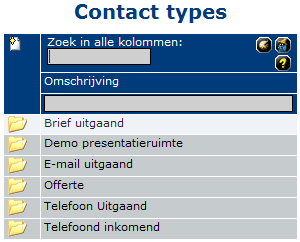 Stamgegevens > Algemeen > Relaties > Contact typesHiermee worden de contactmomenten met de relaties als type vastgelegd.