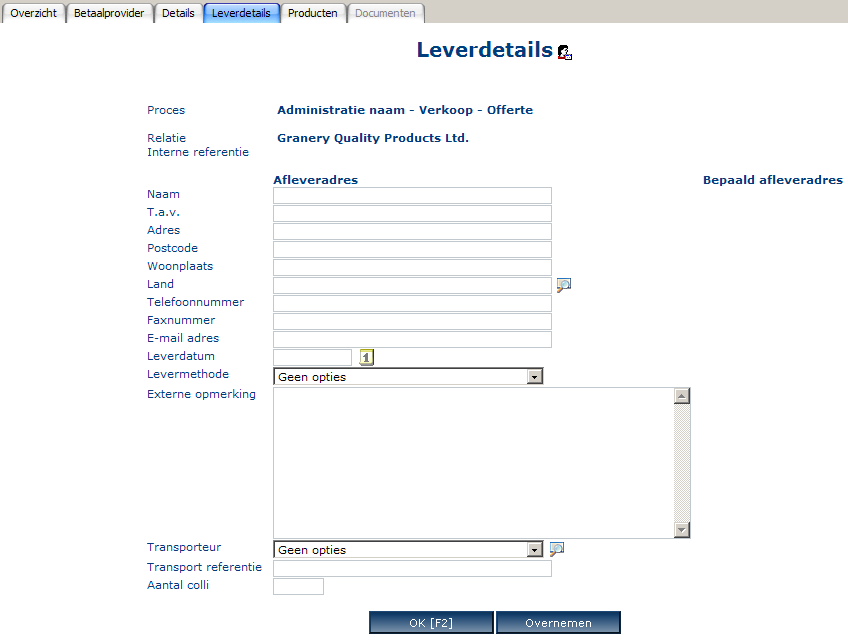 Intelly Business Enterprise - Offerte - tabblad Leverdetails